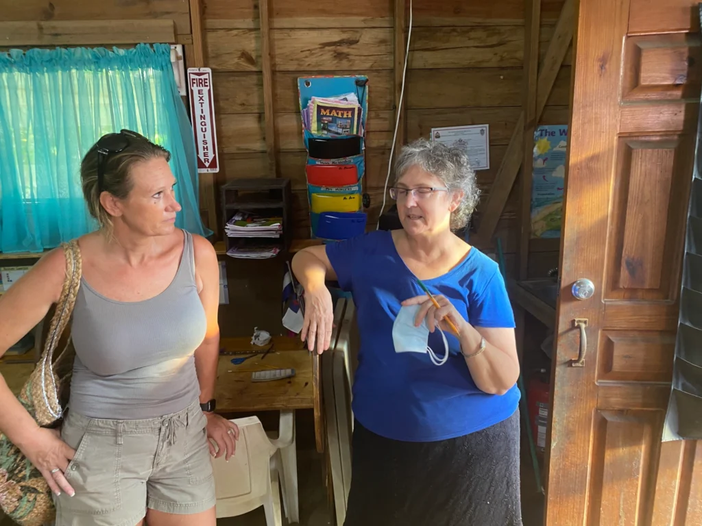 At the top of a hill on the east side of the village, we come to the local private school. Inside we meet Deborah Hunnicut from Oklahoma, who is one of the teachers. She has lived on the island for 11 years. I ask if she has a teaching background.