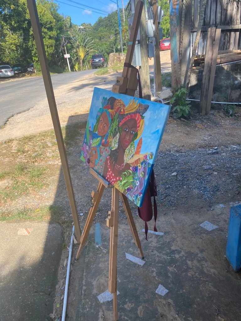 Along the main road, we come to a small sales stall where there are some paintings hanging on the wall outside. Inside, we meet the artist Brittany, who since 2010 has mainly painted motifs with animals and fish from the Caribbean Sea, or of African culture. The latter is strong for most people with ancestors from Africa, they are proud of it, and Brittany’s paintings usually have fresh colors.