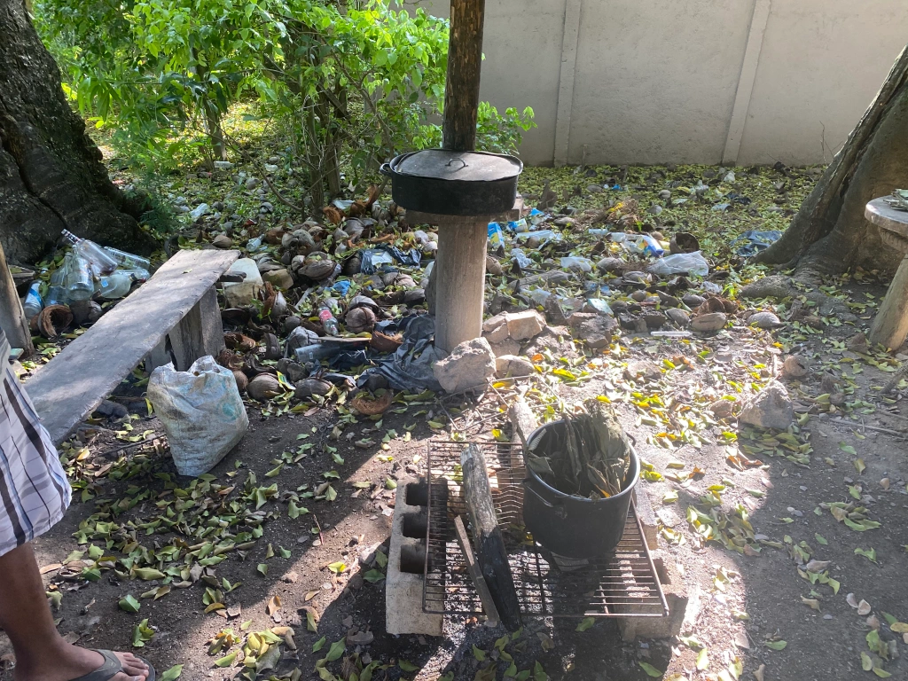We eventually come to a half-finished house which is currently only a drying space for clothes, waiting for the owner to earn more money to complete the construction. In the doorway sits Otis, who is Steven’s grandfather. He is a so-called “bush doctor”, that is a kind of medicine man who brews herbs to relieve or heal various ailments and diseases. Faith in natural medicine is strong in the people and others come from far and wide to get the healing elixir. Otis lists a number of diseases that he can cure and mentions, among other things, diabetes. Since I am diabetic, I ask him to cook something for me. Is it worth a try? He indicates that he has already prepared a product for someone who will arrive a few days later, but that I could buy it and he would make a new one. It looks fine until he comes back with a 2.5 liter can that had “chlorine” on it (!). Which probably means that I should stay far away from this jug. He still gets $20 for it from me. He should be credited for the effort, but I leave the elixir of herbs with a splash of chlorine untested.