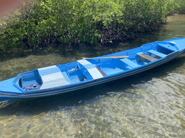 We go down along a pier that takes us through the mangroves. At the end of the pier is a turquoise boat.