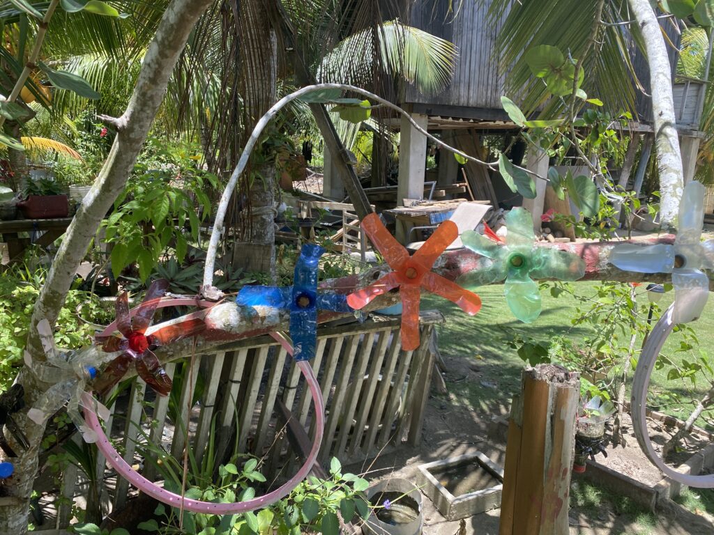 Winston and his family live down by the sea in two log cabins, one of which is a kitchen, dining area and living room, while the other is a bedroom. Outside, his wife has decorated the garden with various materials she has found. Plastic bottles have become flowers and bicycle wheels form a fence. And it is planted in whatever is available to plant in. Even a small boat engine has found its place in this creation.
